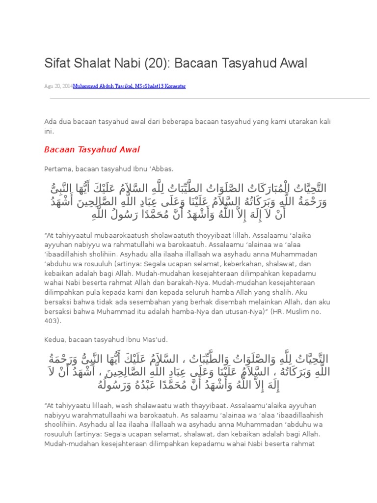 Vqfz5 Hujula0m from blue.kumparan.com Ya allah anugerahkanlah kesejahteraan atas nabi muhammad dan ke atas keluarga nabi muhammad. Penjelasan mengenai bacaan tahiyat awal dan akhir, cara duduk iftirasy dan tawarruk tasyahud awal dan akhir serta lafadz doa sunnah sesudah tahiyat. Attahiyatul mubarakatus solawatut taiyibatu laillah. Bacaan doa tahiyat akhir ini sama dengan bacaan tahiyat awal, hanya saja ada penambahan dua bagian utama. Langsung aja ya bacaanya apa. Bacaan tahiyat akhir muhammadiyah yang akan kami sampaikan sudah termasuk arab dan latin beserta artinya. Bacaan ketika tahiyat awal dalam rumi: Asyhaduallaa ilaaha illallaah, wa asyhadu anna muhammadan 'abduhu wa rosuuluh (tasyahud awal).