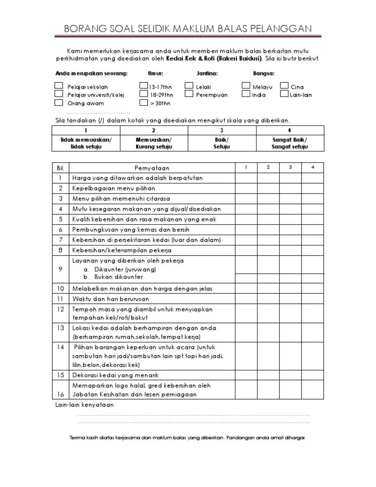 Kepuasan pelanggan sendiri yaitu respon atau tanggapan yang diberikan para konsumen setelah terpenuhinya kebutuhan mereka akan sebuah. Borang kaji selidik kepuasan pelanggan. Pekerjaankakitangan kerajaan kakitangan swastabagi kriteria di bawah, nyatakan tahap kepuasan anda pada skala 1 hingga 5. This questionnaire surveys on students's satisfactions toward the faculty of education. Oleh ilmu ekonomi id posting komentar. Come browse our large digital warehouse of free sample essays. Perbadanan kemajuan tanah adat melaka. Umur10 12 tahun 13 20 tahun 21 55 tahuna4. Anda mengisi borang kaji selidik ini melalui. Contoh borang soal selidik tahap kepuasan pelanggan mp3 & mp4. Kajian kepuasan pelanggan 2020 jabatan perangkaan malaysia (dosm) dilaksanakan untuk mendapatkan pandangan dan maklum balas kajian ini bermula pada 17 julai 2020 dan akan tamat pada 28 ogos 2020. Pusat operasi murninets kebangsaan (pomk), planmalaysia sedang melaksankan kajian soal selidik dibawah program jaringan penunjuk pembangunan mampan bandar luar bandar malaysia (murninets), planmalaysia, kementerian wilayah. Sehubungan itu, pihak pbpp ingin menjemput anda untuk memberi maklumbalas dengan melengkapkan borang kaji selidik kepuasan pelanggan yang disediakan.