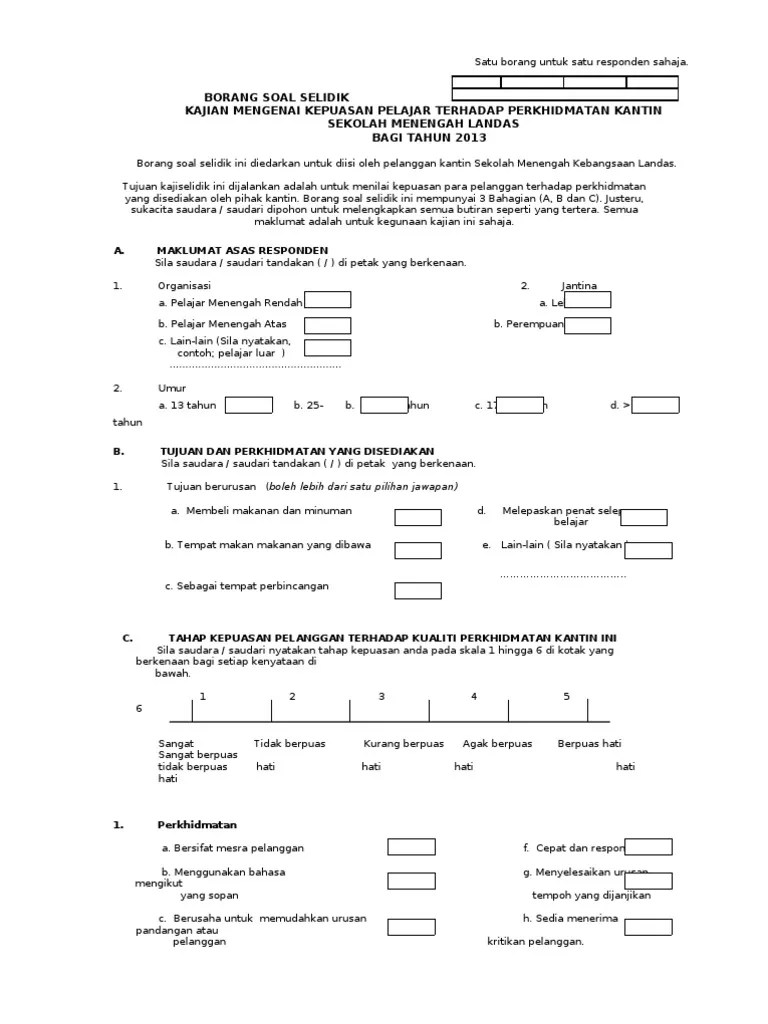 Text of borang kaji selidik sek. Sehubungan itu, pihak pbpp ingin menjemput anda untuk memberi maklumbalas dengan melengkapkan borang kaji selidik kepuasan pelanggan yang disediakan. This questionnaire surveys on students's satisfactions toward the faculty of education. Kepuasan pelanggan adalah selisih antara harapan, persepsi serta pengorbanan pembeli maupun pelanggan terhadap kenyataan hasil / produk yang pengertian kepuasan pelanggan menurut kotler dalam rambat lupiyoadi dan a. Soal selidik ini bertujuan untuk mengenalpasti kepuasan diri pelajar di fakulti pendidikan (fp). Come browse our large digital warehouse of free sample essays. Ini boleh dibahagikan kepada tiga aspek iaitu; Borang kaji atau soal selidik ini perlu dibuat dalam perlaksanaan dan disertakan dalam pelaporan tugasan wajib bagi ujian pelbagai instrumen (geografi) pentaksiran tingkatan 3 (pt3) kajian lapangan atau lebih dikenali sebagai kerja kursus, agar menjelaskan lagi hasil dapatan dan maklumat yang. Borang kaji selidik kepuasan pelanggan unit pos & kenderaan, bahagian pentadbiran bahagian ini sedang berusaha untuk meningkatkan kualiti perkhidmatan kepada semua pelanggan. Borang kaji soal selidik tingkahlaku delinkuen. Borang kaji selidik kepuasan pelanggan. Borang kajiselidik kemudahan dan perkhidmatan bahagian ini sedang berusaha untuk meningkatkan kualiti perkhidmatan kepada semua pelanggan. [kaji selidik ini bertujuan untuk menilai kepuasan pelanggan terhadap perkhidmatan yang disediakan oleh jabatan penerangan malaysia (japen).