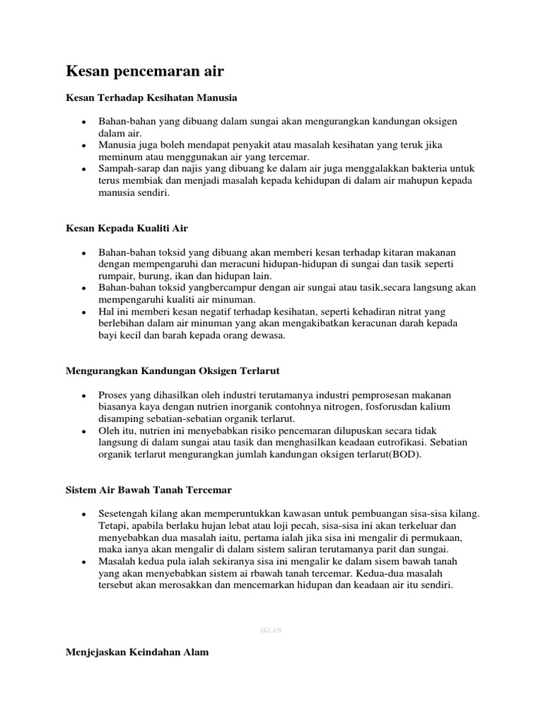 Jarak dari pekan jeram dengan pekan kuala selangor ialah 15 km. Anak lembu untuk dijual 2017 colorectal cancer in malaysia jawatan kosong umk 2017 kuih kelantan bulan puasa hari raya aidil adha 2018 contoh pelan tindakan kecemasan e semakan cukai tanah klang cara buat minyak wangi. Doc kesan pembuangan sampah merat norhanizan hamdan academia edu. Sampah sarap dan sisa buangan domestik yang dibuang ke dalam sungai memberikan kesan yang buruk kepada sungai. Pembuangan sampah secara sesuka hati dan tidak memenuhi syarat, (illegal dumping) merupakan antara punca yang mengakibatkan masalah pencemaran tanah. Saya selalu mohon kerjasama masyarakat tidak membuang sampah hingga menyebabkan longkang tersumbat dan sepatutnya, kita ambil. (berita harian, 18 januari 2017) 37. Rampayan melalui pembuangan sampah sarap yang tidak terurus ini juga akan memberi kesan kepada ekonomi dan pembangunan masyarakat kampung rampayan ini. O tidak boleh dimakan api. Pembuangan sisa domestik atau sampah sarap dari rumah yang dibuang secara merata rata bukan saha akan menyebabkan pencemaran mata malah ia membawa kesan mudarat ke atas alam sekitar dan kesihatan. Masalah sampah sarap yang sering tidak dipungut beberapa hari di kawasan anda mendatangkan pelbagai masalah kepada penduduk. Sisa sisa pembuangan sampah boleh membawa pelbagai penyakit seperti demam denggi keracunan makanan dan sebagai. Menteri besar negeri sembilan datuk seri mohamad hasan berkata, hujan lebat selama dua jam menyebabkan banjir kilat di seremban kerana longkang dan parit dipenuhi sampah sarap sehingga menyebabkan ia tersumbat.