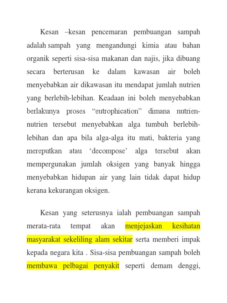 Punca utama yang dapat dilihat secara zahir adalah berlakunya pembuangan sampah sarap oleh individu yang tidak bertanggungjawab ke dalam sungai. Daripada pembuangan sampah sarap yang tidak teratur ini seperti demam. Tambahan pula, kesan pembuangan sampah boleh menwujudkan pencemaran udara di alam sekeliling. Penyebaran wabak penyakit taun terutamanya melalui air. Menteri besar negeri sembilan datuk seri mohamad hasan berkata, hujan lebat selama dua jam menyebabkan banjir kilat di seremban kerana longkang dan parit dipenuhi sampah sarap sehingga menyebabkan ia tersumbat. Doc kesan pembuangan sampah merat norhanizan hamdan academia edu. Apabila masyarakat membuang sampah ke atas tanah, tanah tersebut akan menjadi habitat bagi pelbagai mikroorganisma yang terdiri daripada bakteria dan virus yang menyebabkan pelbagai jenis penyakit. Sebagai setiausaha penduduk, anda dikehendaki menulis surat aduan tentang masalah yang kerap berlaku. (berita harian, 18 januari 2017) 37. Pembuangan sampah sarap sisa toksik dan pepejal serta sistem kumbahan. Masalah sampah sarap yang sering tidak dipungut beberapa hari di kawasan anda mendatangkan pelbagai masalah kepada penduduk. Rampayan melalui pembuangan sampah sarap yang tidak terurus ini juga akan memberi kesan kepada ekonomi dan pembangunan masyarakat kampung rampayan ini. Melupuskan sampah sarap di tempat yang sepatutnya.