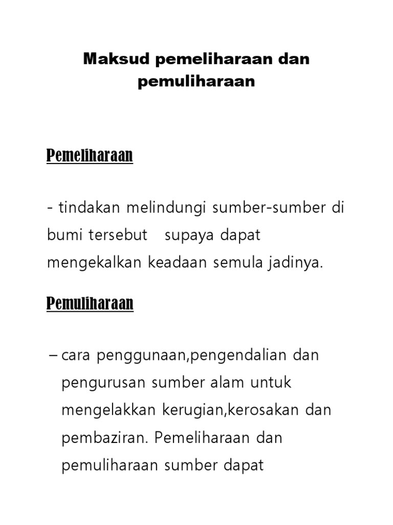 Savesave pemeliharaan dan pemuliharaan alam sekitar for later. Mencari sumber tenaga alternatif seperti tenaga. Kerajaan menggariskan beberapa prinsip seperti yang berikut: Pemeliharaan dan pemuliharaan alam sekitar ■ pemeliharaan dan pemuliharaan alam sekitar patut dikuatkuasakan untuk: Prinsip ini perlu melibatkan kerjasama dari semua pihak. (1981), pemuliharaan dan pemeliharaan alam sekitar amat perlu dilaksanakan kerana alam sekitar memainkan peranan. Banyak perkara yang boleh kita lakukan untuk tujuan ini. Hal ini dapat dilihat dengan berlakunya bencana alam yang begitu berleluasa seperti tsunami , banjir besar , gempa bumi , tanah runtuh dan sebagainya. Pemeliharaan dan pemuliharaan alam sekitar. A short video that tells a brief explanation about preserving and protecting nature / video pendek yang menerangkan tentang pemuliharaan dan pemeliharaan. 0 ratings0% found this document useful (0 votes). Pencemaran alam sekitar akan menyebabkan penurunan taraf kesihatan dan keselamatan penduduk. Kepentingan pemeliharaan dan pemuliharaan alam sekitar.