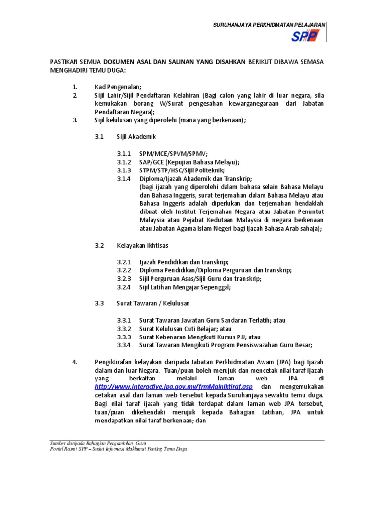 Dokumen yang perlu dibawa (borang yang diberi untuk diisi + resume + sijil) i) borang. Jangan pernah memandang remeh terhadap semua aspek ketika menghadiri temuduga. Semua dokumen ini mestilah di photostat dan disarankan untuk mendapatkan pengesahan oleh pensyarah/ pengetua/ pegawai kerajaan bahagian 1 atau yang sewaktu dengannya. Pastikan salinan tersebut clear untuk dibaca. Nombor angka giliran bagi temuduga akan diberikan semasa pendaftaran bagi calon yang membawa maklumat lengkap seperti yang diperlukan.